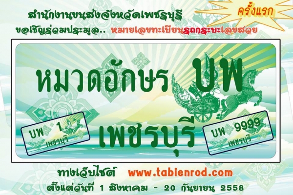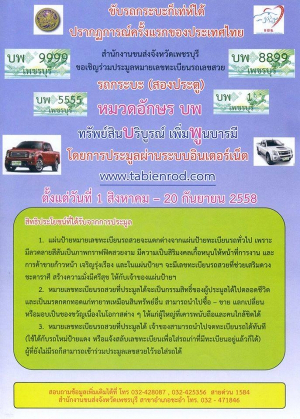 ขอเชิญประมูลหมายเลขทะเบียนรถเลขสวย รถกระบะ(สองประตู) ครั้งแรก ของจังหวัดเพชรบุรี หมวดอักษร "บพ"