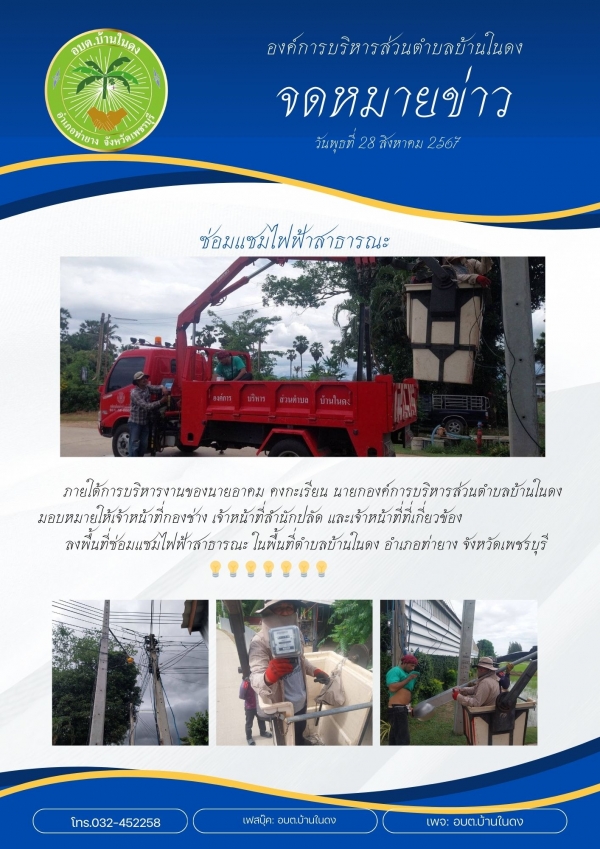 มอบหมายให้เจ้าหน้าที่กองช่าง เจ้าหน้าที่สำนักปลัด และเจ้าหน้าที่ที่เกี่ยวข้อง ลงพื้นที่ซ่อมแซมไฟฟ้าสาธารณะ ตำบลบ้านในดง อำเภอท่ายาง จังหวัดเพชรบุรี