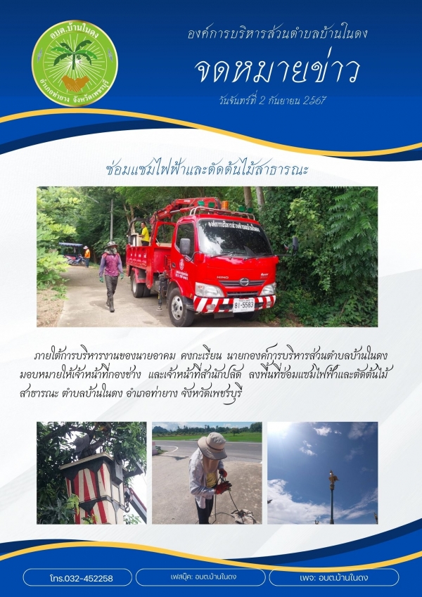มอบหมายให้ เจ้าหน้าที่กองช่าง และเจ้าหน้าที่สำนักปลัด ลงพื้นที่ซ่อมแซมไฟฟ้าและตัดต้นไม้สาธารณะ ตำบลบ้านในดง อำเภอท่ายาง จังหวัดเพชรบุรี