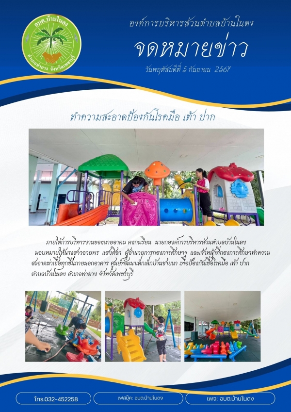 มอบหมายให้นางสาวอวยพร แสงศิลา ผู้อำนวยการกองการศึกษาฯ และเจ้าหน้าที่กองการศึกษาทำความสะอาดฆ่าเชื้อทุกชิ้นภายนอกอาคาร ศูนย์พัฒนาเด็กเล็กบ้านชายนา เพื่อป้องกันเชื้อโรคมือ เท้า ปาก ตำบลบ้านในดง อำเภอท่ายาง จังหวัดเพชรบุรี