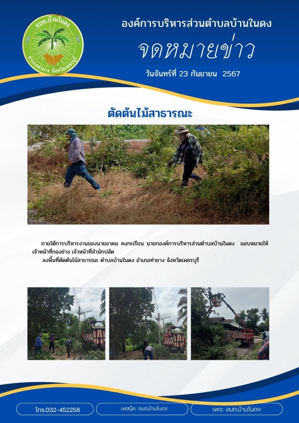 มอบหมายให้เจ้าหน้าที่กองช่าง และเจ้าหน้าที่สำนักปลัด ลงพื้นที่ตัดต้นไม้สาธารณะ ตำบลบ้านในดง อำเภอท่ายาง จังหวัดเพชรบุรี