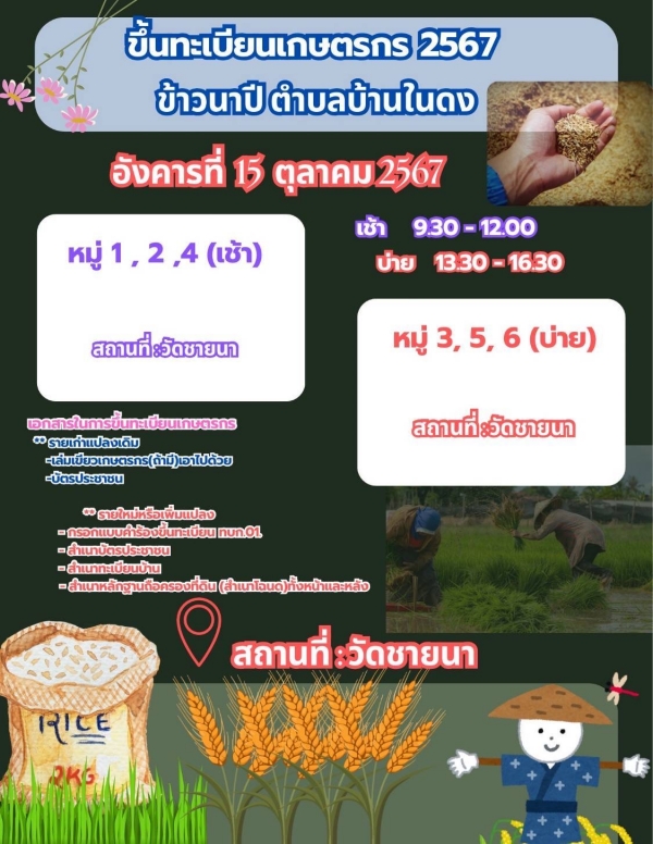 ข่าวฝากประชาสัมพันธ์ ขึ้นทะเบียนเกษตรกร 2567 ข้าวนาปี ตำบลบ้านในดง