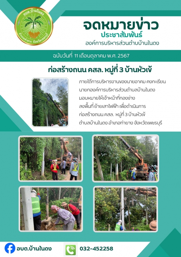 วันศุกร์ที่ 11 ตุลาคม 2567 ย้ายเสาไฟฟ้า เพื่อดำเนินการ ก่อสร้างถนน คสล. หมู่ที่ 3 บ้านหัวเข้