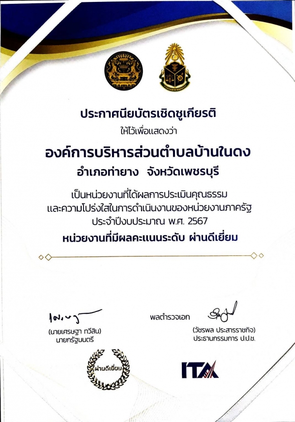 นายอาคม คงกะเรียน นายกองค์การบริหารส่วนตำบลบ้านในดงรับรางวัลหน่วยงานที่มีผลการประเมินคุณธรรมและความโปร่งใสในการดำเนินงานของหน่วยงานภาครัฐ (ITA) ประจำปีงบประมาณ 2567 ในระดับผ่านดีเยี่ยม
