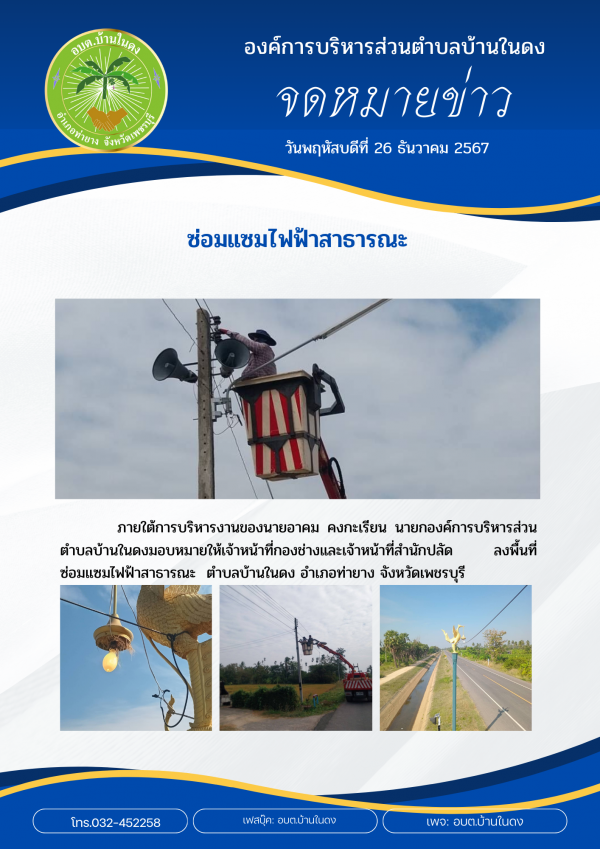 มอบหมายให้เจ้าหน้าที่กองช่าง และเจ้าหน้าที่สำนักปลัด ลงพื้นที่ซ่อมแซมไฟฟ้าสาธารณะ ตำบลบ้านในดง อำเภอท่ายาง จังหวัดเพชรบุรี