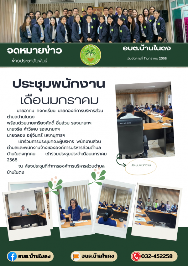 เข้าร่วมการประชุมคณะผู้บริหาร พนักงานส่วนตำบลและพนักงานจ้างขององค์การบริหารส่วนตำบลบ้านในดงทุกคน เข้าร่วมประชุมประจำเดือนมกราคม 2568