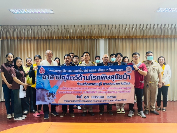 ร่วมกับสำนักงานปศุสัตว์อำเภอท่ายาง กลุ่มพัฒนาสุขภาพสัตว์ โดยนายอติกัณต์ หว่านพืช นายสัตวแพทย์ปฏิบัติการ จัดโครงการฝึกอบรมเพื่อสร้างและพัฒนาศักย์ภาพอาสาปศุสัตว์ด้านโรคพิษสุนัขบ้า ประจำปีงบประมาณ 2568 ให้แก่อาสาปศุสัตว์รายใหม่ให้มี ความเข้าใจและทักษะในการปฏิบัติงานด้านการเฝ้าระวัง ป้องกันและควบคุมโรคพิษสุนัขบ้าและบูรณาการการกำจัดโรคพิษสุนัขบ้าแบบยั่งยืน โดยมีจำนวนเป้าหมายของอาสาปศุสัตว์ฯ ในปีงบประมาณ 2568 จำนวน 9 ราย