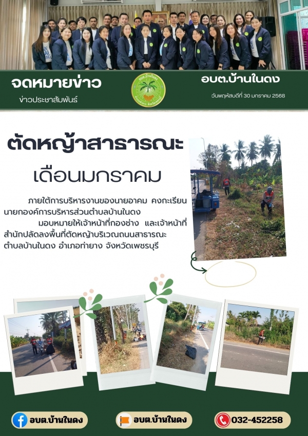 มอบหมายให้เจ้าหน้าที่กองช่าง และเจ้าหน้าที่สำนักปลัด ลงพื้นที่ตัดหญ้าบริเวณถนนสาธารณะ ตำบลบ้านในดง อำเภอท่ายาง จังหวัดเพชรบุรี