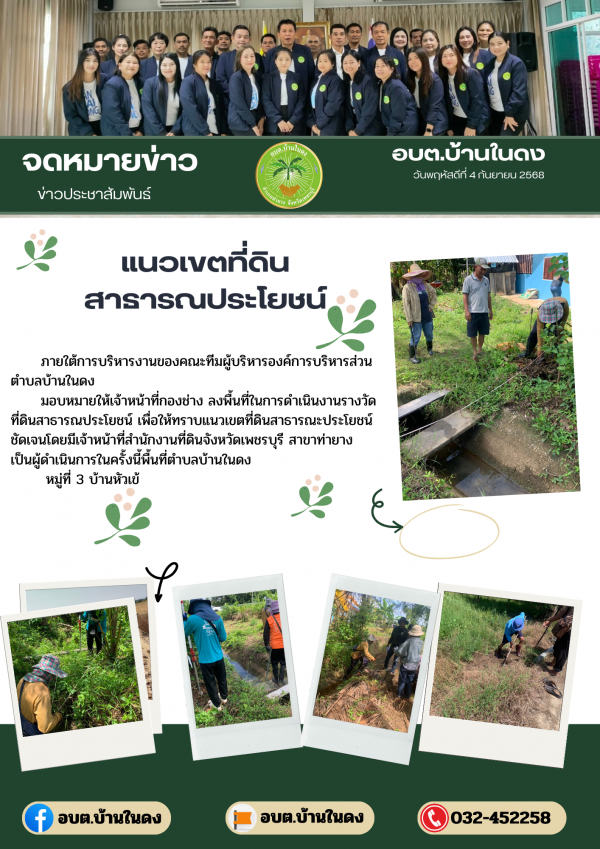 มอบหมายให้เจ้าหน้าที่กองช่าง ลงพื้นที่ในการดำเนินงานรางวัดที่ดินสาธารณประโยชน์ เพื่อให้ทราบแนวเขตที่ดินสาธารณะประโยชน์ชัดเจนโดยมีเจ้าหน้าที่สำนักงานที่ดินจังหวัดเพชรบุรี สาขาท่ายาง เป็นผู้ดำเนินการในครั้งนี้พื้นที่ตำบลบ้านในดง