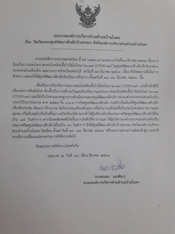 ประกาศปิดศูนย์พัฒนาเด็กเล็กบ้านชายนา