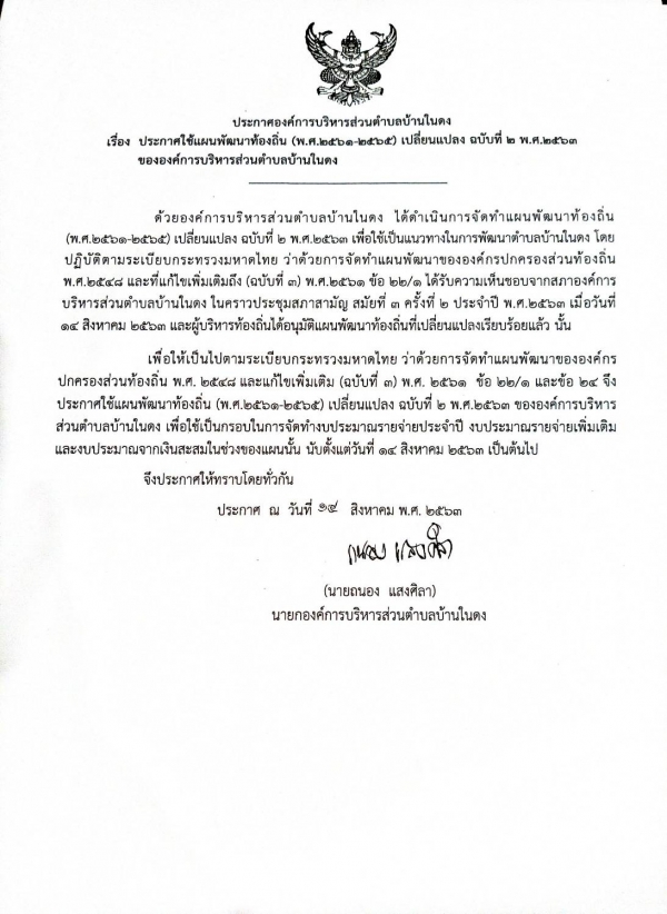ประกาศใช้แผนพัฒนาท้องถิ่น (พ.ศ.๒๕๖๑-๒๕๖๕) เปลี่ยนแปลง ฉบับที่ ๒ พ.ศ. ๒๕๖๓