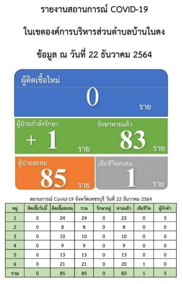สถานการณ์โควิด-19 ตำบลบ้านในดง อำเภอท่ายาง จังหวัดเพชรบุรี ข้อมูล ณ วันที่ 22 ธันวาคม 2564