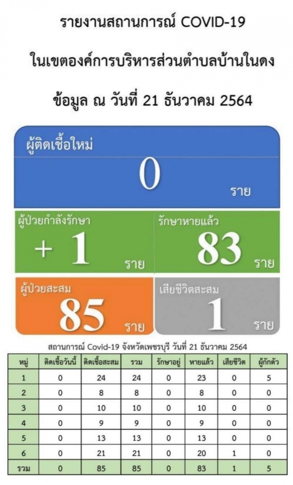 สถานการณ์โควิด-19 ตำบลบ้านในดง อำเภอท่ายาง จังหวัดเพชรบุรี ข้อมูล ณ วันที่ 21 ธันวาคม 2564