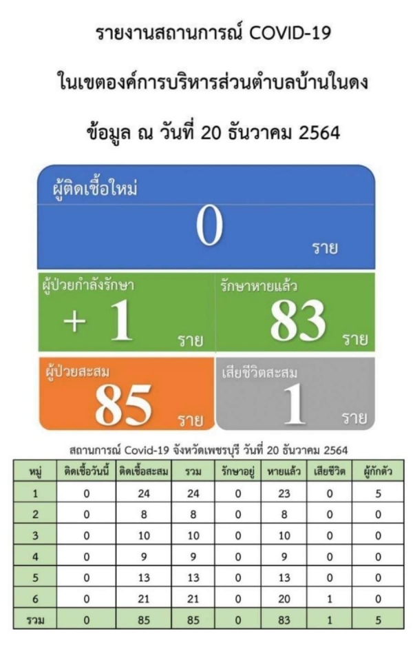 สถานการณ์โควิด-19 ตำบลบ้านในดง อำเภอท่ายาง จังหวัดเพชรบุรี ข้อมูล ณ วันที่ 20 ธันวาคม 2564
