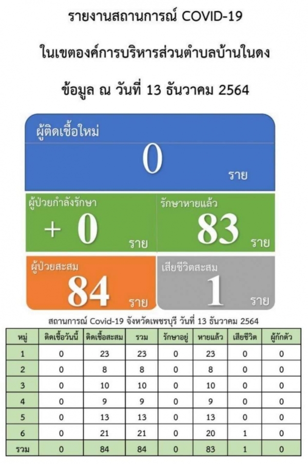 สถานการณ์โควิด-19 ตำบลบ้านในดง อำเภอท่ายาง จังหวัดเพชรบุรี ข้อมูล ณ วันที่ 13 ธันวาคม 2564