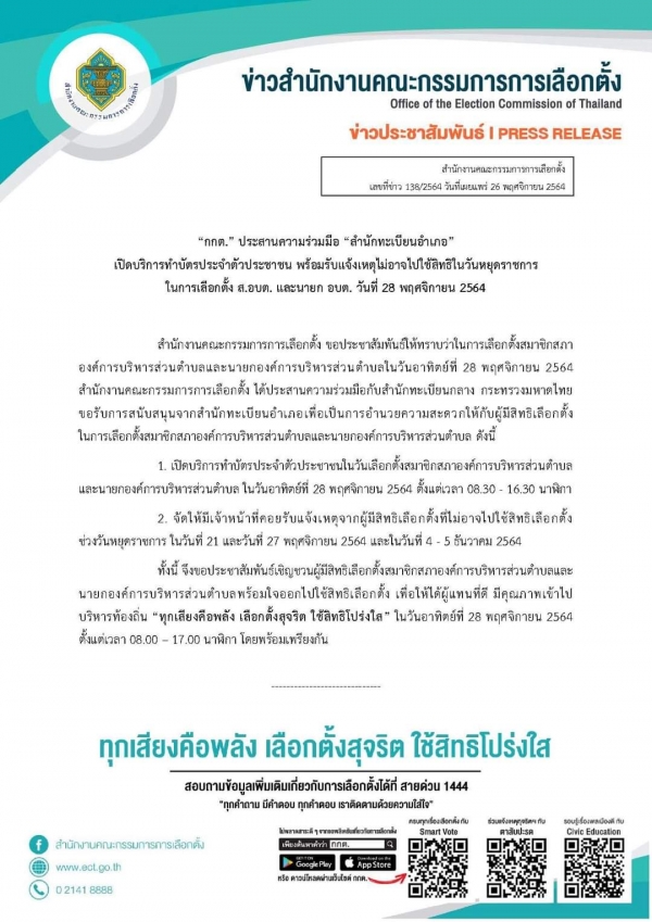 “กกต.” ประสานความร่วมมือ “สำนักทะเบียนอำเภอ” เปิดบริการทำบัตรประจำตัวประชาชน พร้อมรับแจ้งเหตุไม่อาจไปใช้สิทธิในวันหยุดราชการในการเลือกตั้ง ส.อบต. และนายก อบต. วันที่ 28 พฤศจิกายน 2564