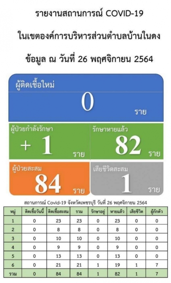 สถานการณ์โควิด-19 ตำบลบ้านในดง อำเภอท่ายาง จังหวัดเพชรบุรี ข้อมูล ณ วันที่ 26 พฤศจิกายน 2564