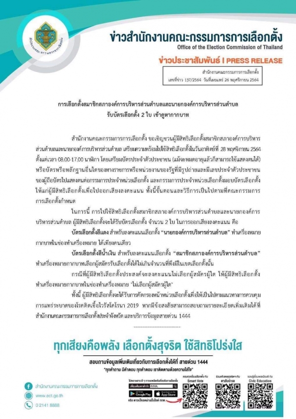 การเลือกตั้งสมาชิกสภาองค์การบริหารส่วนตำบลและนายกองค์การบริหารส่วนตำบล รับบัตรเลือกตั้ง 2 ใบ เข้าคูหากากบาท