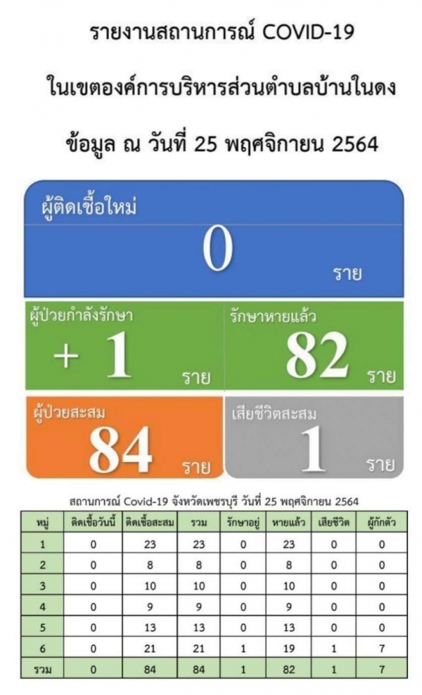 สถานการณ์โควิด-19 ตำบลบ้านในดง อำเภอท่ายาง จังหวัดเพชรบุรี ข้อมูล ณ วันที่ 25 พฤศจิกายน 2564