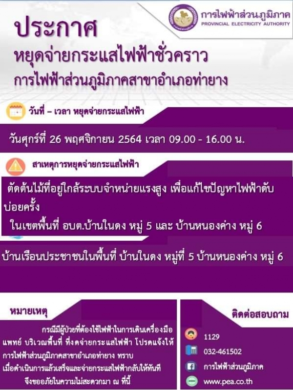 ขอแจ้ง ดับกระแสไฟฟ้าแรงสูง เพื่อตัดต้นไม้ใกล้ไลน์ระบบจำหน่ายแรงสูง บริเวณ พื้นที่ อบต.บ้านในดง หมู่ที่ 5 บ้านหนองค่าง หมู่ที่ 6 และบริเวณพื้นที่ หนองจอก หมู่ที่ 2, 3 ในวันศุกร์ที่ 26 พฤศจิกายน 2564 ตั้งแต่เวลา 9.00 - 16.00 น. ตามรายละเอียดในเอกสาร ขออภัยในความไม่สะดวกมา ณ ที่นี้ด้วย