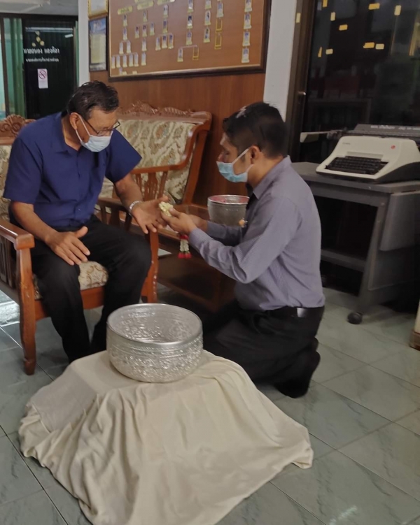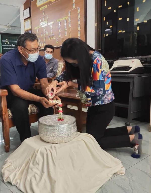 รดน้ำขอพรจาก นายถนอง แสงศิลา นายก อบต.บ้านในดง เนื่องในโอกาสวันสงกรานต์หรือปีใหม่ไทยที่กำลังจะมาถึง ปี พ.ศ.2564