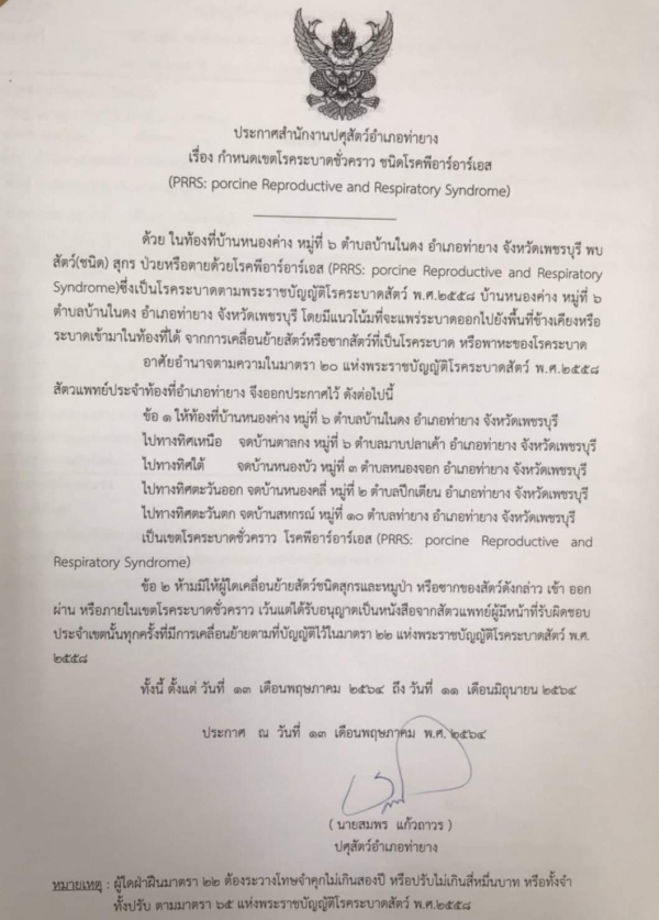 ประกาศสำนักงานปศุสัตว์อำเภอท่ายาง เรื่อง กำหนดเขตโรคระบาดชั่วคราว ชนิด โรคพีอาร์อาร์เอส