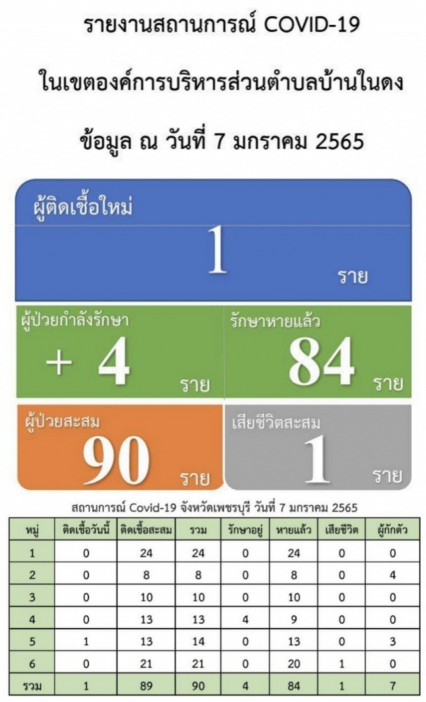 สถานการณ์โควิด-19 ตำบลบ้านในดง อำเภอท่ายาง จังหวัดเพชรบุรี ข้อมูล ณ วันที่ 7 มกราคม 2565
