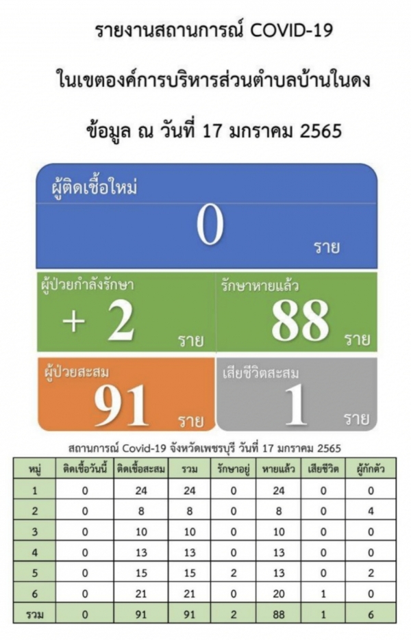 สถานการณ์โควิด-19 ตำบลบ้านในดง อำเภอท่ายาง จังหวัดเพชรบุรี ข้อมูล ณ วันที่ 17 มกราคม 2565