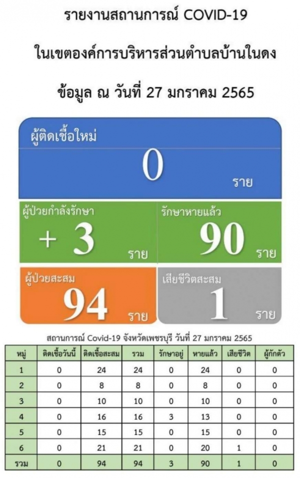 สถานการณ์โควิด-19 ตำบลบ้านในดง อำเภอท่ายาง จังหวัดเพชรบุรี ข้อมูล ณ วันที่ 27 มกราคม 2565