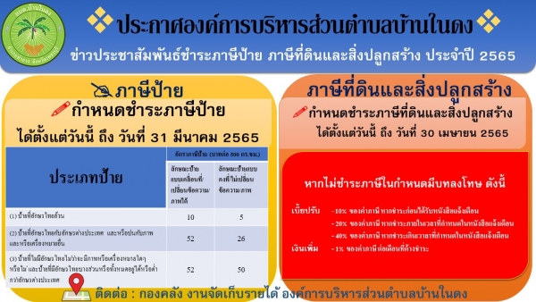 #ประชาสัมพันธ์การชำระภาษีท้องถิ่น ประจำปี 2565 กองคลัง งานจัดเก็บรายได้ องค์การบริหารส่วนตำบลบ้านในดง ขอเชิญชวนประชาชนในเขตองค์การบริหารส่วนตำบลบ้านในดง ชำระภาษีท้องถิ่นประจำปี พ.ศ. 2565 ภายในเวลาที่กฎหมายกำหนด ดังนี้