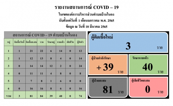 ข้อมูล ณ วันที่ 10 เดือนมีนาคม พ.ศ. 2565 พบผู้ติดเชื้อ 3 ราย