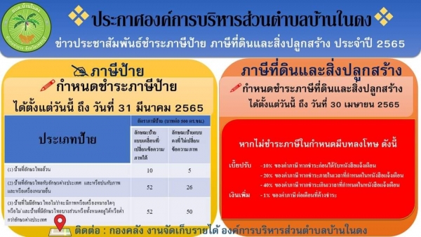 #ประชาสัมพันธ์การชำระภาษีท้องถิ่น ประจำปี 2565 กองคลัง งานจัดเก็บรายได้ องค์การบริหารส่วนตำบลบ้านในดง ขอเชิญชวนประชาชนในเขตองค์การบริหารส่วนตำบลบ้านในดง ชำระภาษีท้องถิ่นประจำปี พ.ศ. 2565 ภายในเวลาที่กฎหมายกำหนด