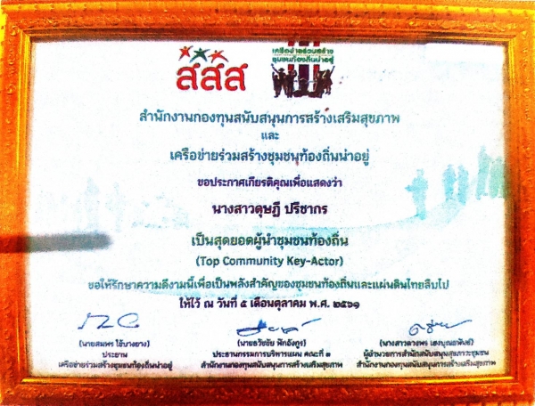 สำนักงานกองทุนสนับสนุนการสร้างเสริมสุขภาพและเครือข่ายร่วมสร้างชุมชนท้องถิ่นน่าอยู่ ขอประกาศเกียรติคุณเพื่อแสดงว่า นางสาวดุษฎี ปรีชากร เป็นสุดยอดผู้นำชุมชนท้องถิ่น (Top Community Key-Actor)